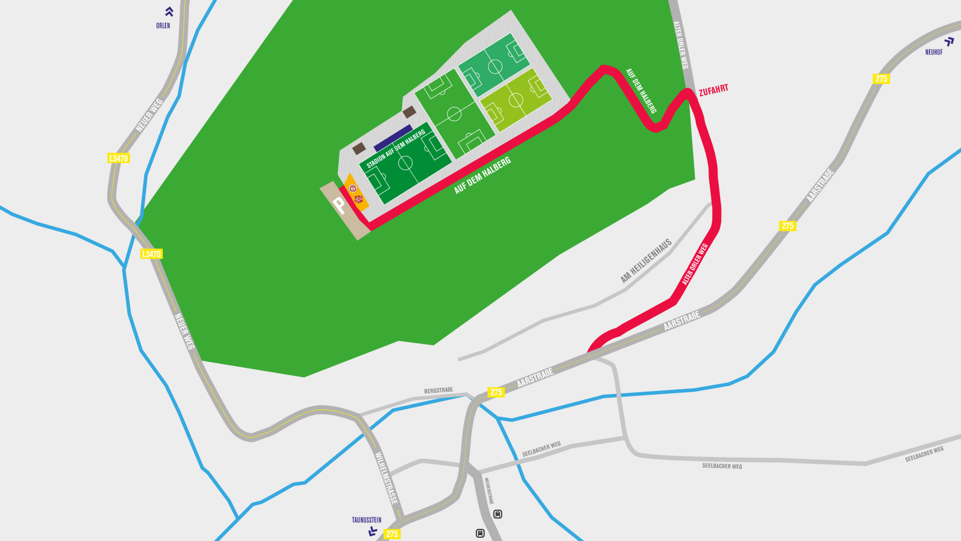 Für die Anreise mit dem Auto geben Sie in Ihr Navigationssystem die Adresse Auf dem Halberg, 65232 Taunusstein ein. Die Zufahrt erfolgt über die B275. Parkmöglichkeiten sind unterhalb des Halbergs vorhanden.