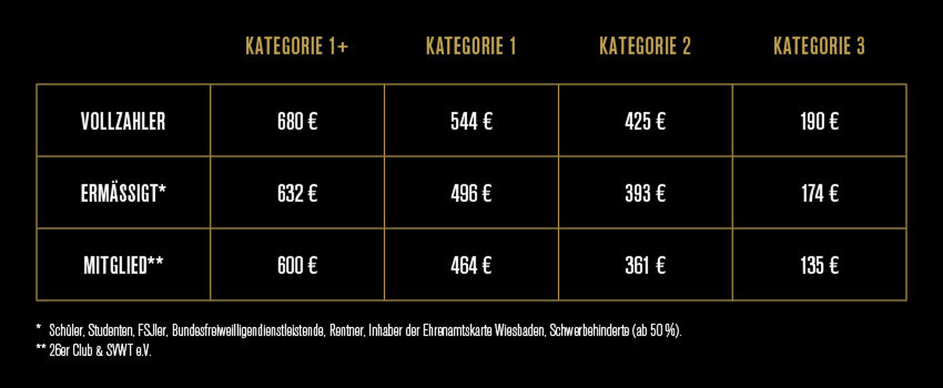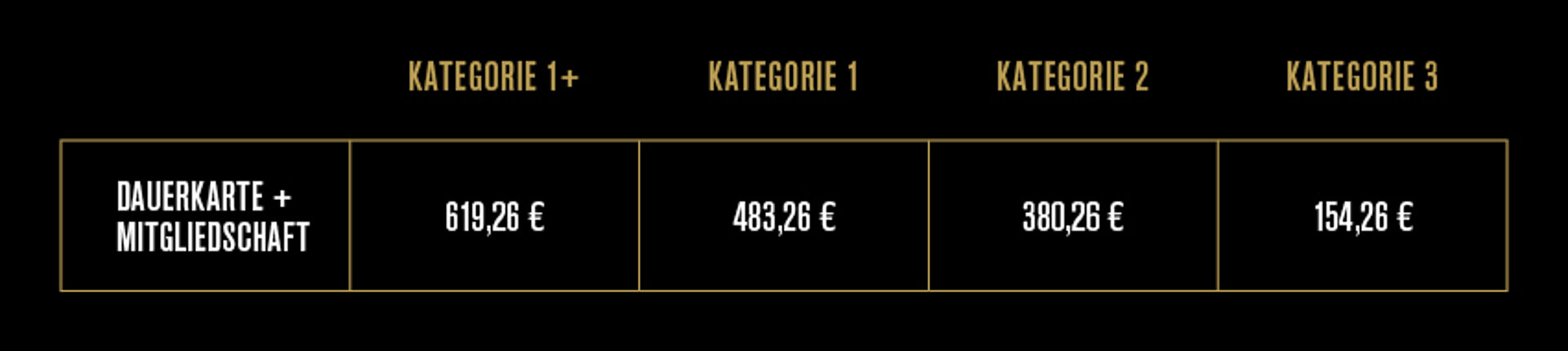 Die Preise für Vollzahler, ermäßigte Dauerkarten und Mitglieder variieren je nach Kategorie wie folgt: