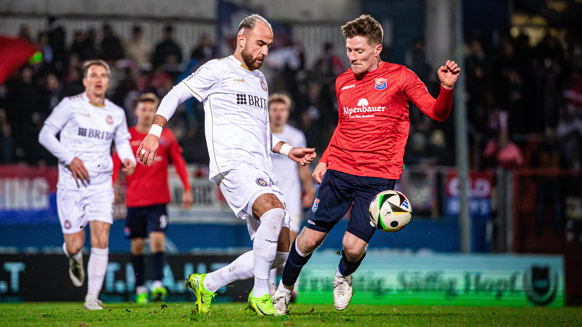 Nick Bätzner zieht im Mittelfeld das Tempo an und bringt sich so in Flankenposition. Zielgenau bedient er den am zweiten Pfosten lauernden Fatih Kaya, der direkt abschließt. Im letzten Moment springt Haching-Innenverteidiger Tim Knipping in die Schussbahn und lenkt die gefährliche Direktabnahme zur Ecke.